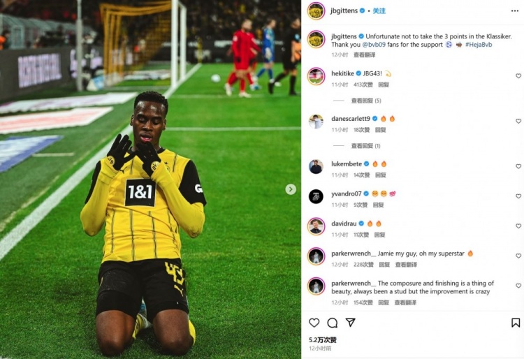 吉滕斯也在赛后通过社媒晒出自己滑跪庆祝进球的照片,并配文:“遗憾没能在德国国家德比全取3分,感谢多特球迷们的支持。”