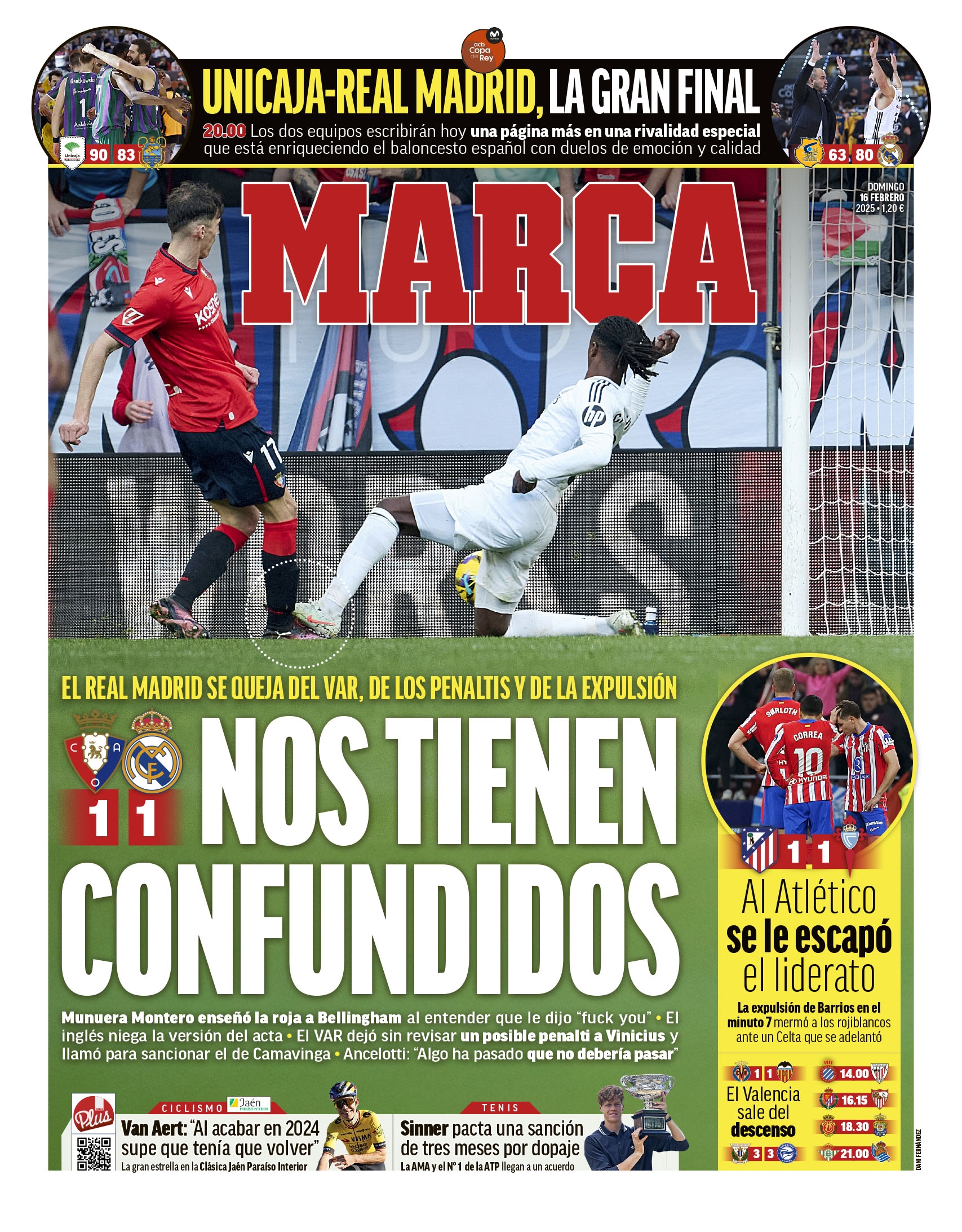 2月16日报道 西甲第24轮比赛,皇马客场1-1战平奥萨苏纳,贝林厄姆染红离场,此役主裁穆努埃拉和VAR的多次判罚引发争议。