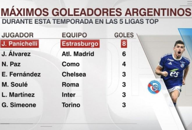 阿尔瓦雷斯曾在西甲第6轮面对巴列卡诺的比赛中戴帽,紧接着与皇马的比赛梅开二度,他原本是五大联赛进球最多的阿根廷球员,但最近未能开张,已经被效力于斯特拉斯堡的阿根廷球员帕尼切利反超。在法甲第9轮比赛中,帕尼切利甩头攻门攻破了里昂球门,帮助球队领先,但之后斯特拉斯堡又是乌龙,又是送点,还有球员被罚下,10人作战的斯特拉斯堡被里昂逆转,以1-2失利。
