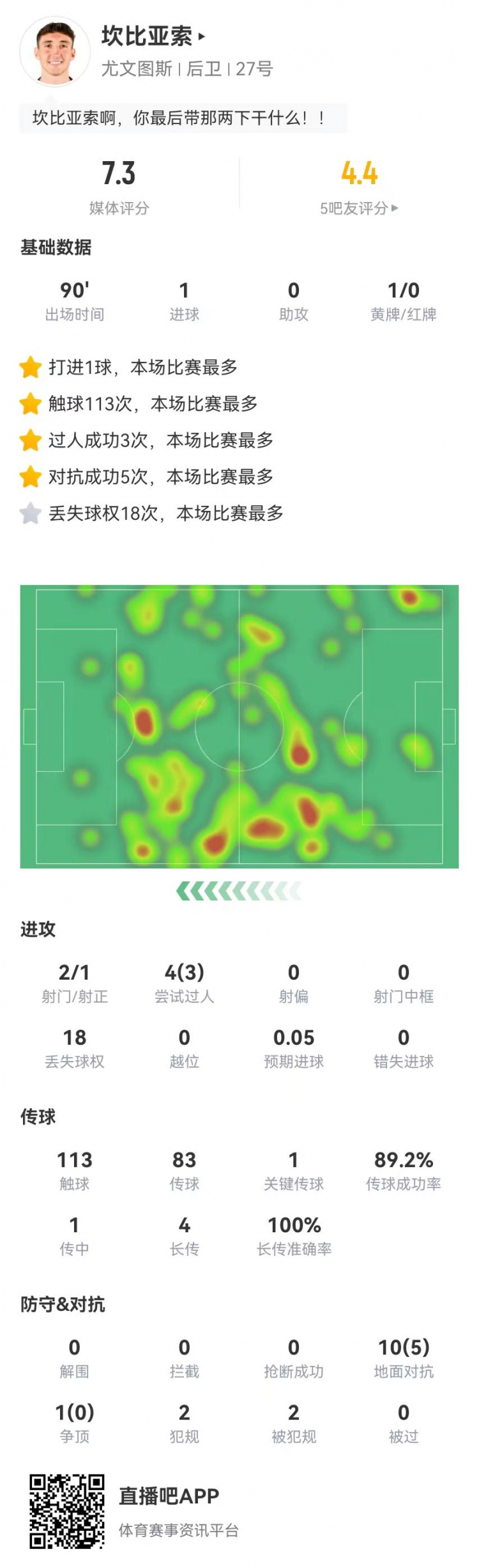 12月2日报道 尤文在本轮意甲1-1战平莱切,坎比亚索本场数据如下: