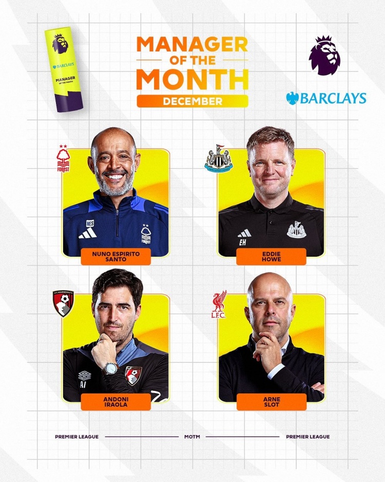 1月2日报道 英超官方公布了12月最佳主帅的候选名单,分别是努诺、埃迪-豪、伊拉奥拉和斯洛特。