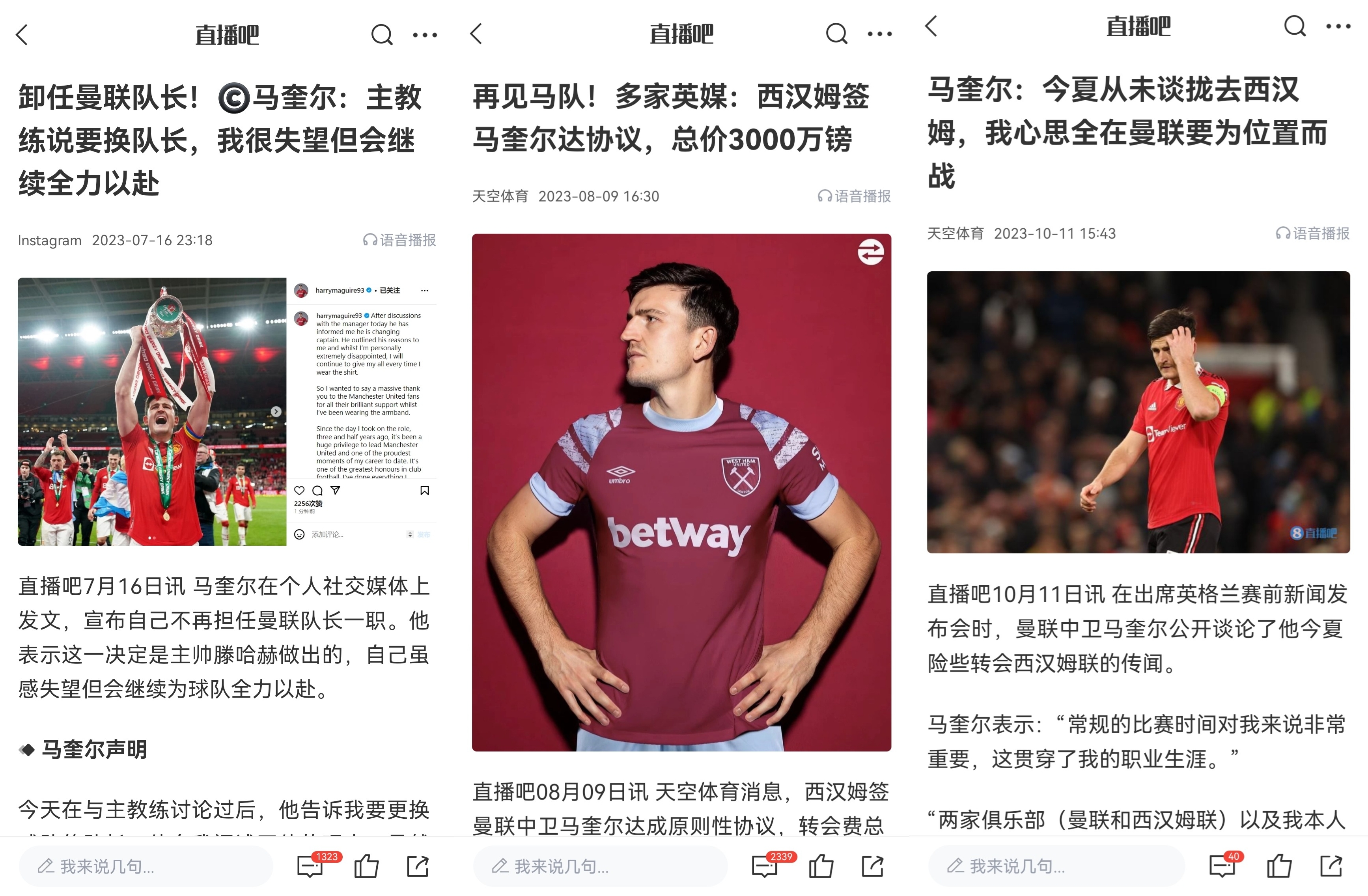 1月3日报道 2023年7月,马奎尔在社媒宣布,主帅滕哈赫告知他想更换队长人选,不久后,曼联官宣B费出任队长,马奎尔一度濒临被卖至西汉姆联。
