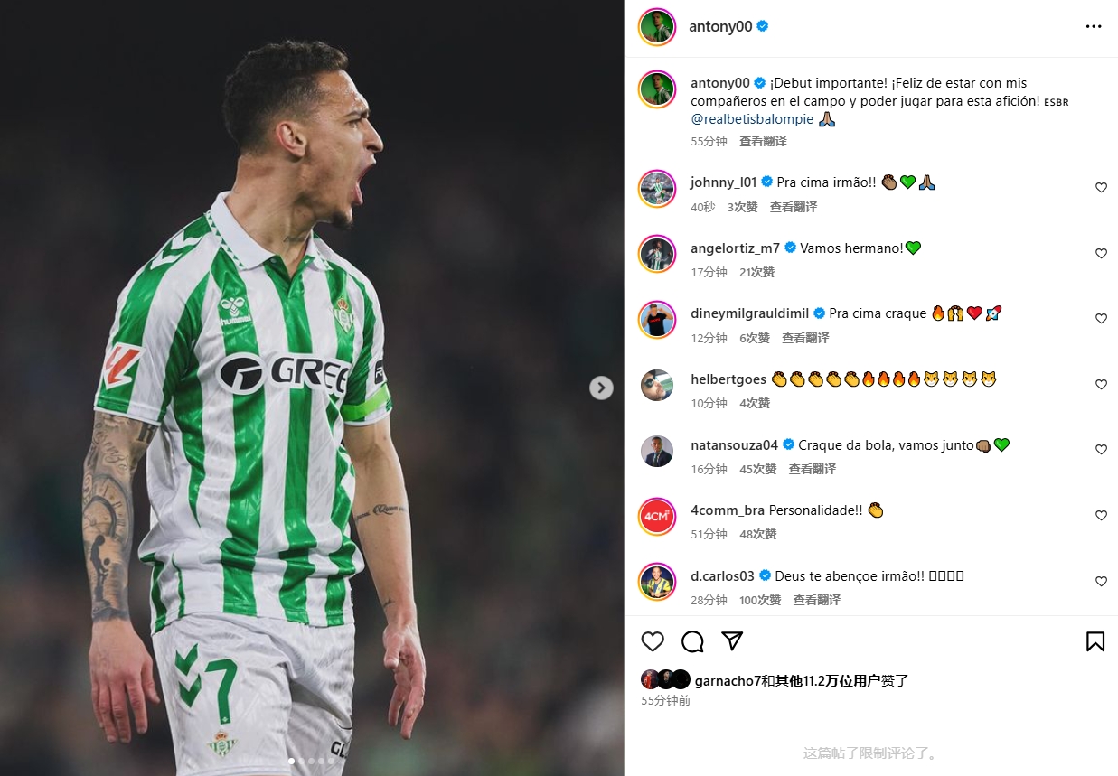 安东尼赛后在社交媒体上写道:“重要的首秀!很高兴与我的队友们在场上并肩作战,为贝蒂斯球迷们踢球!”