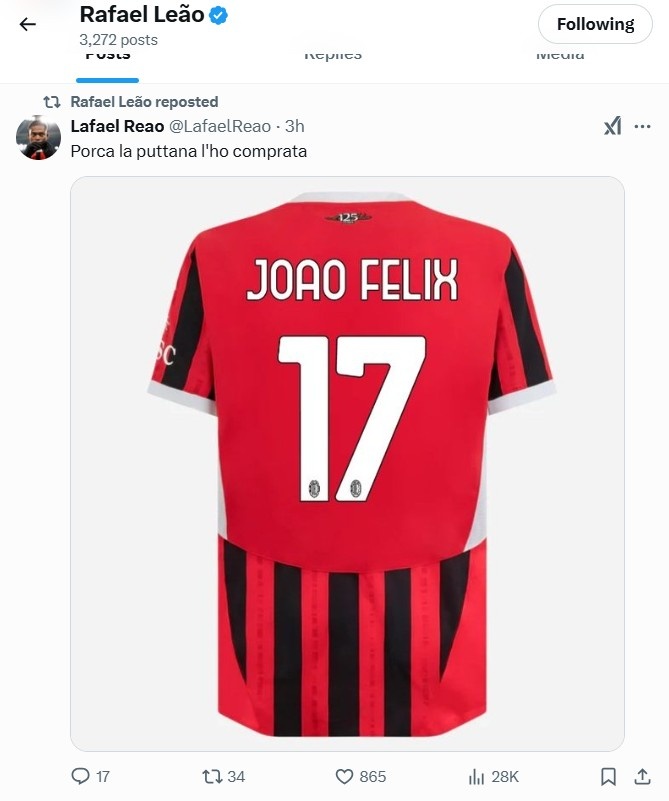 米兰边锋莱奥在社媒上转发了一则动态,动态中这位米兰球迷博主表示道:“该死,我买了这件球衣”。