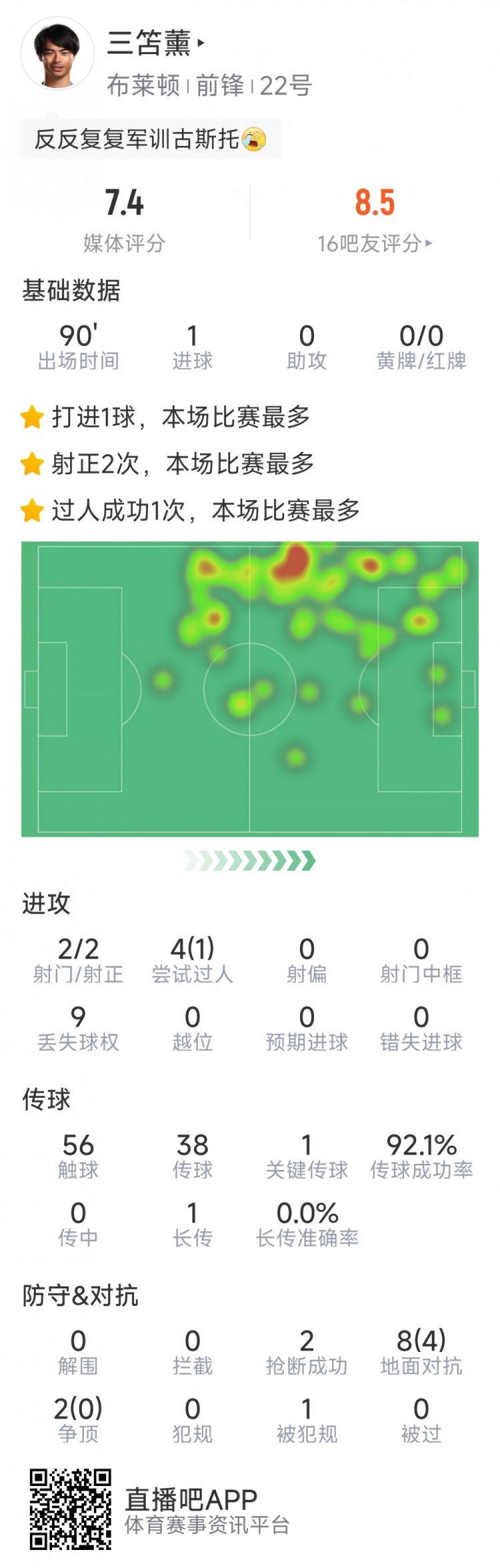2月9日报道 在本轮足总杯,布莱顿2-1击败切尔西,三笘薫打进一球,以下为他在本场数据: