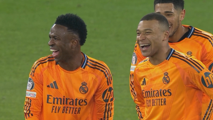 之后镜头给到皇马球员,维尼修斯和贝林在和姆巴佩说笑,维尼修斯还比了个手势。
