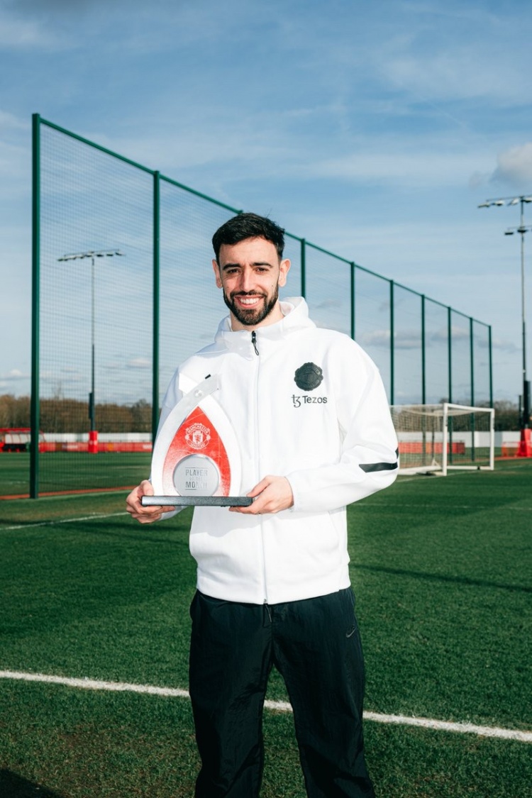 3月2日报道 曼联官方晒出了B费领取二月最佳球员奖杯的照片。